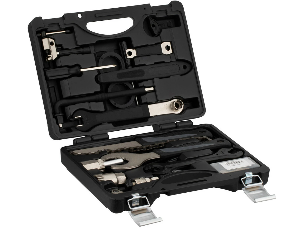 Mit diesem Werkzeugkoffer hast Du alles, was Du brauchst, um die gängigsten Wartungsarbeiten an Deinem Rad selbst zu machen: von der Kettenpeitsche und dem Abzieher für den Wechsel der Kassette an Schnellspann- oder Steckachsnaben über Innensechskantschlüssel, Torxschlüssel und Gegenhalter, die Dir den Tausch Deines Kettenblatts ermöglichen, bis hin zum Kettennieter mit Ersatzpin, mit dem Du sogar Deinen kompletten Antrieb selbst tauschen kannst.