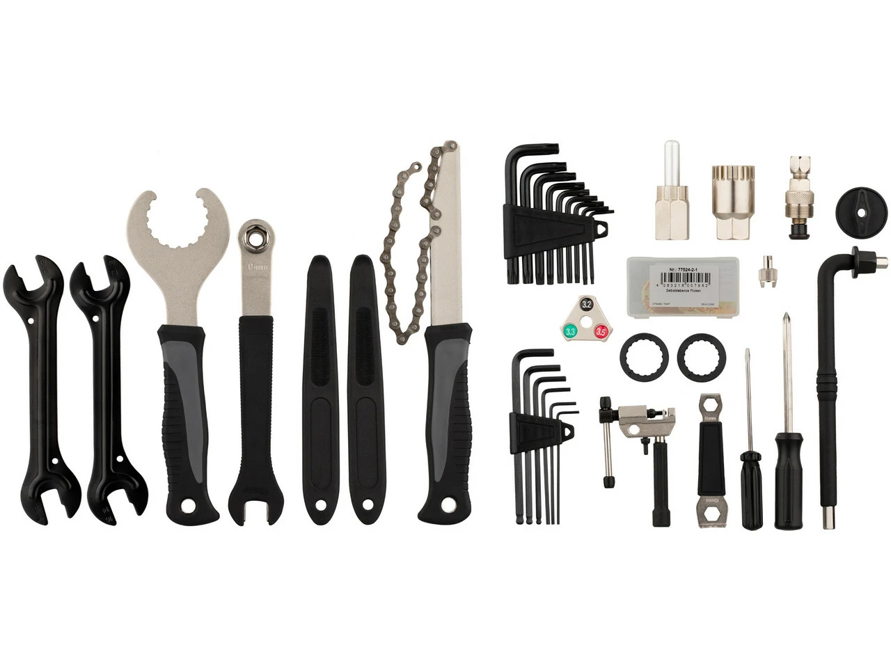 Für den Wechsel von Patronenlagern sind Kurbelabzieher und Innenlagerwerkzeug dabei. Der Schlüssel für außenliegende Lagerschalen passt auf alle gängigen Hollowtech II, GXP und Campagnolo Lager. Dank der Öffnung im Schlüssel können Lager auch ohne die Demontage der Kurbel nachgezogen werden. Für Shimano SM-BB9000 BB93 und SM-BBR60 liegen passende Adapter dabei. Selbst Laufräder können mit dem Speichenschlüssel nachgespannt oder die Konuslager nachgestellt werden. Natürlich sind auch für einfache Montagearbeiten, wie den Wechsel von Anbauteilen oder die Schaltwerkseinstellung, alle Werkzeuge dabei. Zum Wechseln von Ventileinsätzen an Auto-/AV-/Schrader- und Sclaverand-/SV-/Presta-/Rennrad-/französischen Ventilen ist ein passender Ventilschlüssel im Lieferumfang. Die stabilen Reifenheber ermöglichen Dir den Wechsel störrischer Reifen und das selbstklebende Flickzeug bringt Dich nach einem Platten schnell wieder auf Dein Bike.