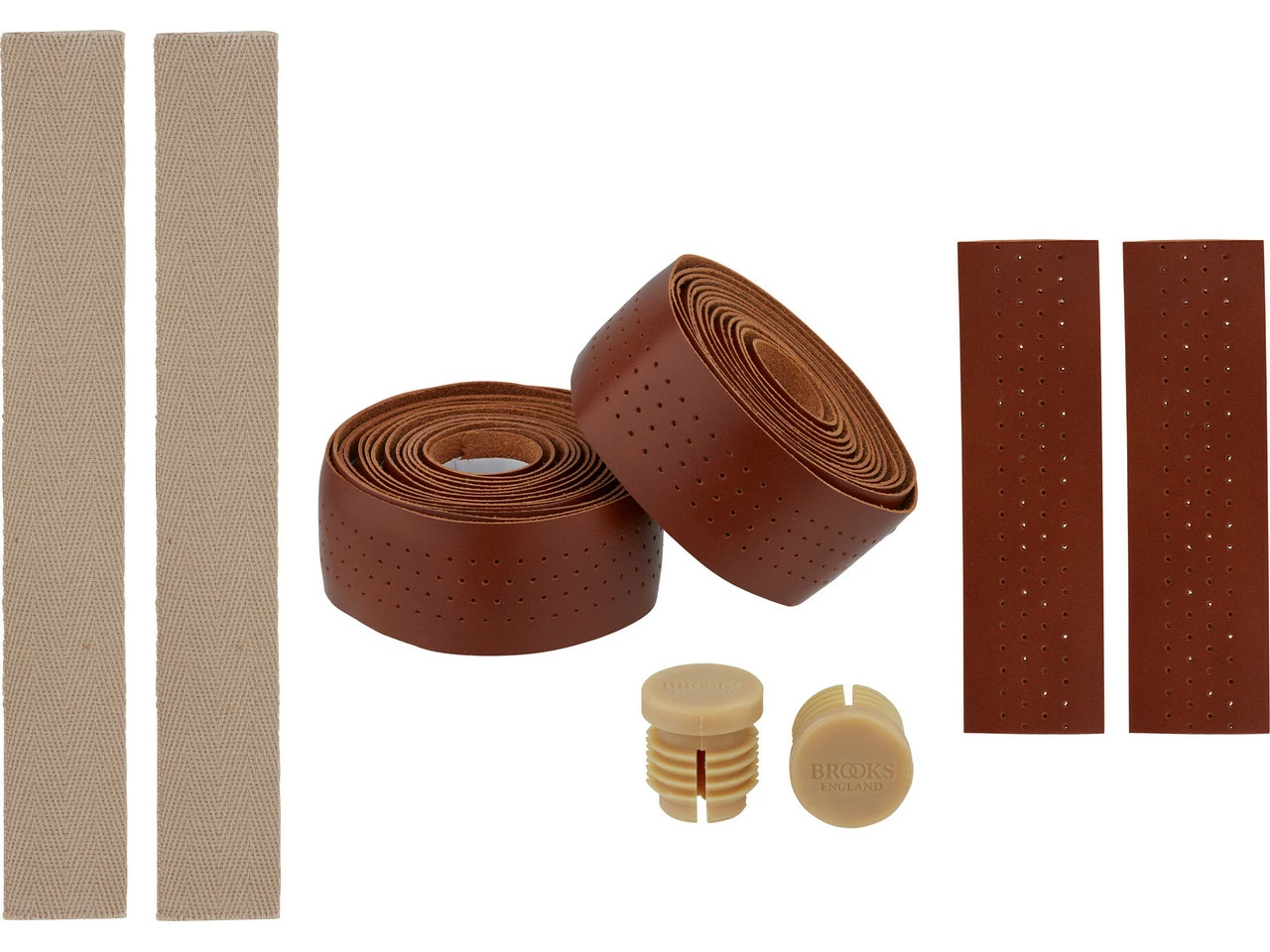Lieferumfang:1 Paar Lenkerbänder Brooks Leather Bar Tape1 Paar Lenkerendstopfen Brooks1 Paar Abschlussbänder Brooks