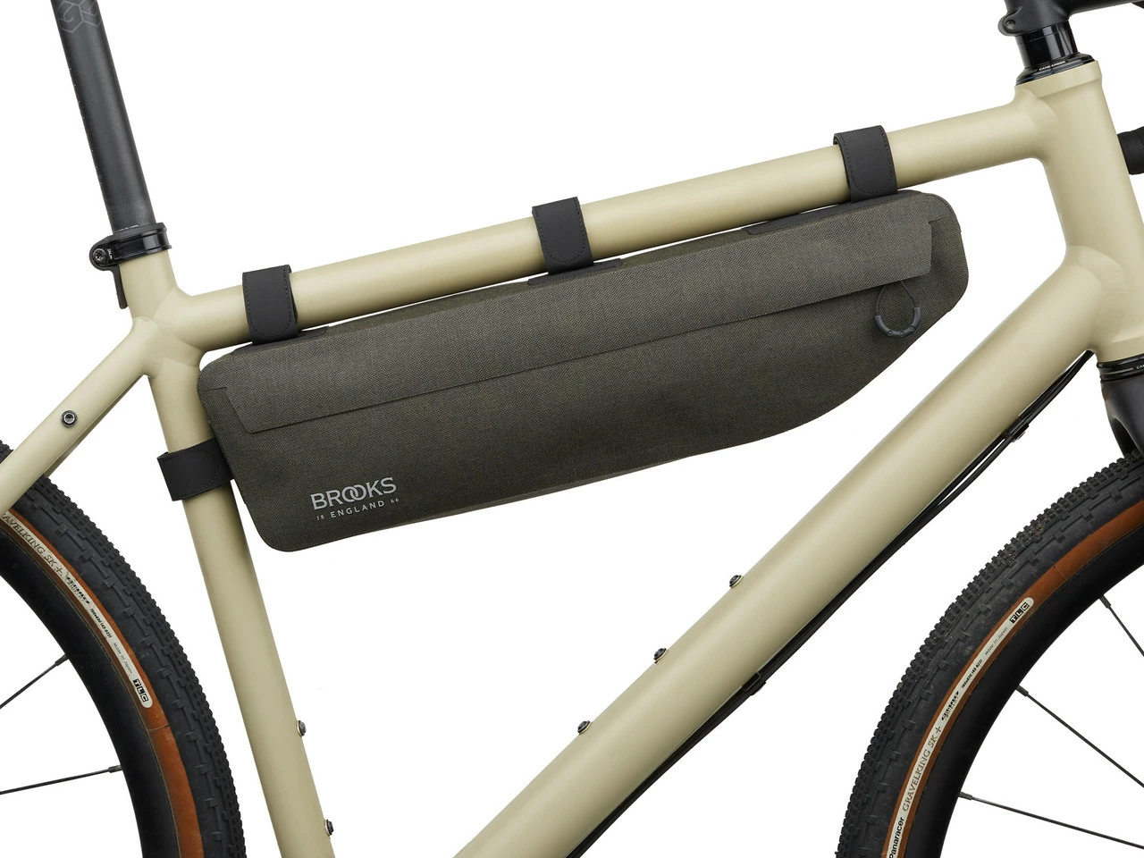 Die Scape Frame Bag Rahmentasche von Brooks passt in die meisten Fahrradrahmen und ist eine wasserdichte Begleitung auf Deinen Bikepacking-Touren.