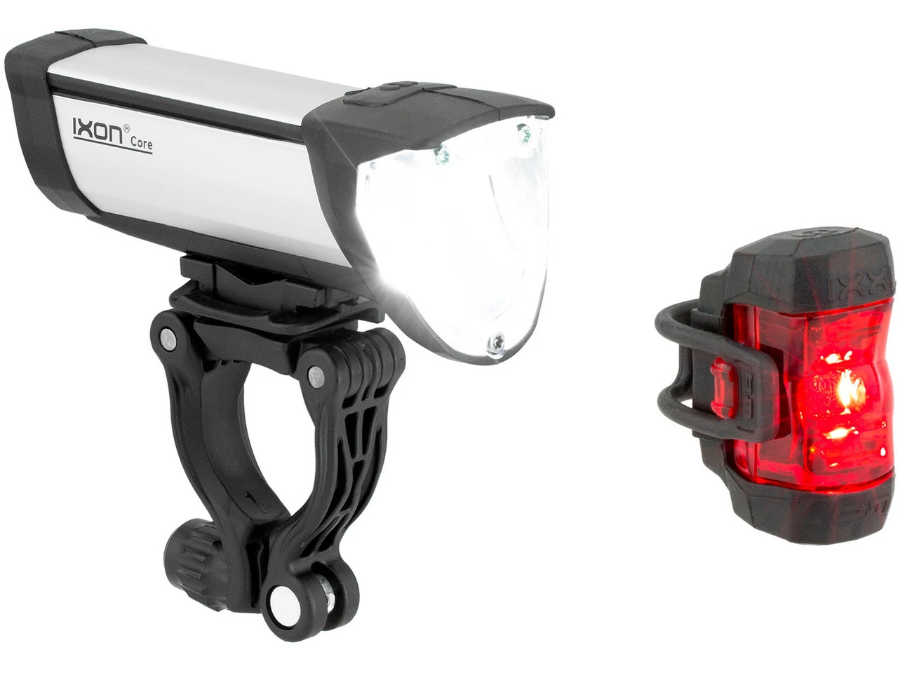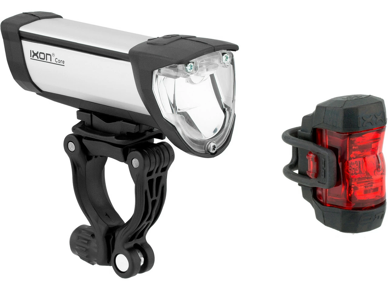 Spezifikationen Frontlicht:Ausführung:Frontlicht (weiß)Montage:UniversalhalterLeuchtmittel:1 x LEDLeuchtkraft:50 LuxLeuchtdauer:ca. 3 Stunden (High-Modus), ca. 15 Stunden (Low-Modus)Betriebsmittel:Akku (Li-Ion), integriertTechnische Daten Frontlicht:Material:AluminiumSchalter:Ein / AusFreigaben Frontlicht:Zulassung im Straßenverkehr:Ja, für Fahrräder (nach §67 StVZO)Prüfziffer:K ~~995Spezifikationen Rücklicht:Ausführung:Rücklicht (rot)Montage:UniversalhalterLeuchtmittel:1 x LEDLeuchtdauer:ca. 15 StundenBetriebsmittel:Akku (Li-Ion), integriertTechnische Daten Rücklicht:Material:KunststoffSchalter:Ein / AusFreigaben Rücklicht:Zulassung im Straßenverkehr:Ja, für Fahrräder (nach §67 StVZO)Prüfziffer:K ~~993Features Frontlicht:für alle Räder zugelassen auf Deutschlands StraßenIQ2-TechnologieAluminiumgehäusespritz- und regenwasserdichtsehr gute und homogene Fahrbahnausleuchtungper Klick abnehmbarpasst an alle Lenkerumlaufende Weichkomponente bieten Stoßschutzlässt sich bequem über Micro-USB-Ladebuchse aufladenFeatures Rücklicht:Akku-Rücklichthochleistungs-LEDsehr hellgroßer Abstrahlwinkelmit Kapazitätsindikatorlässt sich bequem über Micro-USB-Ladebuchse aufladenLieferumfang:1 x Frontlicht busch+müller Ixon Core1 x Halter busch+müller Ixon Core1 x Lithium-Ionen-Akku busch+müller Ixon Core1 x Rücklicht busch+müller IXXI1 x Lithium-Akku busch+müller IXXI1 x Befestigungsmaterial busch+müller IXXI und Lithium-Akku1 x USB-Kabel1 x Ladegerät
