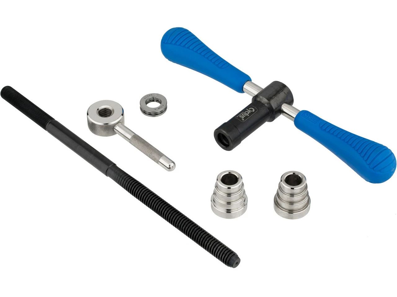 Hinweis: Dieses Werkzeug dient zum gleichmäßigen Einpressen der oberen und unteren Steuersatzschale in das Steuerrohr. Überprüfe unbedingt vor der Montage die Maßhaltigkeit der Schalensitze im Steuerrohr und korrigiere diese mit entsprechenden Steuerrohrfräsern. Verwende Fett beim Einpressen!