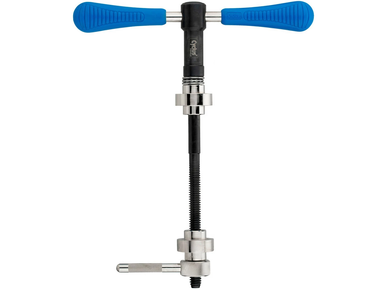 Lieferumfang:1 x Drehspindel Cyclus Tools mit T-Griff1 Paar Einpresskloben Cyclus Tools mit Trapezgewinde1 x Drucklager Cyclus Tools1 x Gewindemuffe Cyclus Tools