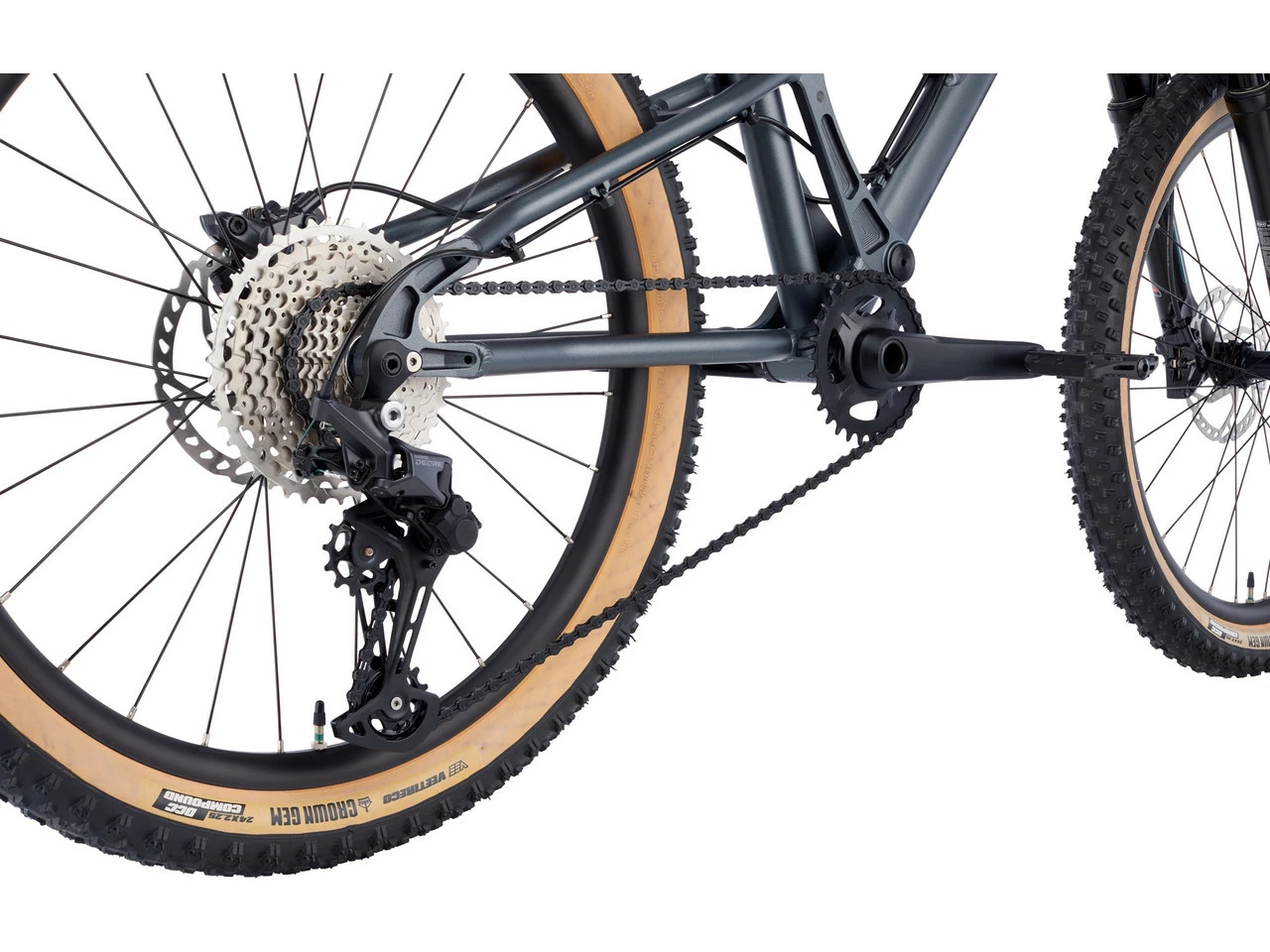 Der leichte Rahmen aus Aluminium mit doppelt konifizierten Rohren und einem CNC-gefrästen Sitzstreben-Yoke steckt so einiges Weg. Die lange, flache Geometrie mit wendigem Hinterbau taugt daher hervorragend für den Einsatz im Bikepark. Die Federgabel mit 120 mm Federweg und der Dämpfer machen bei Sprüngen einen zuverlässigen Job und mildern diverse Unebenheiten ab. Die 11-fach Shimano-Deore-Rapidfire-Schaltung bietet eine große Bandbreite, um schnell bergauf und bergab zu pedalieren. Deore-Bremsen liefern notwendige Kontrolle. Auch die übrige Komponentenliste des Bikes lässt Mountainbiker-Herzen höherschlagen: Straight-Pull-Naben, Steckachsen, Tubeless-Ready-Laufräder, Direct Mount Kurbeln mit niedrigem Q-Faktor, Riser-Lenker und mehr. Dein Kind wünscht sich ein waschechtes Trailbike? Hier ist es!