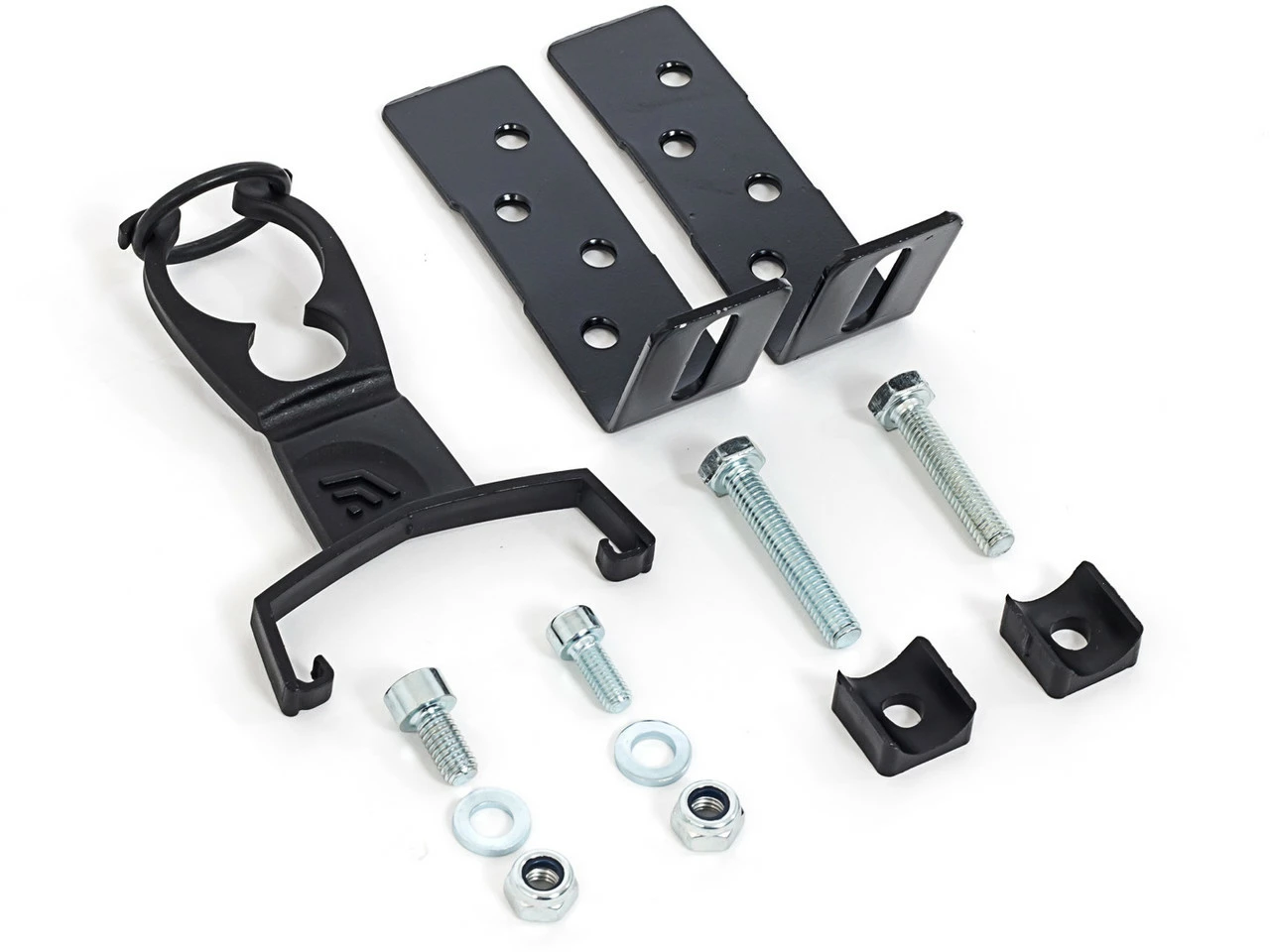 Das Befestigungsset für das Hebie Viper Schutzblech enthält zwei lange, breite Befestigungswinkel, Bolzen, Muttern und Sattelrohrklemme.