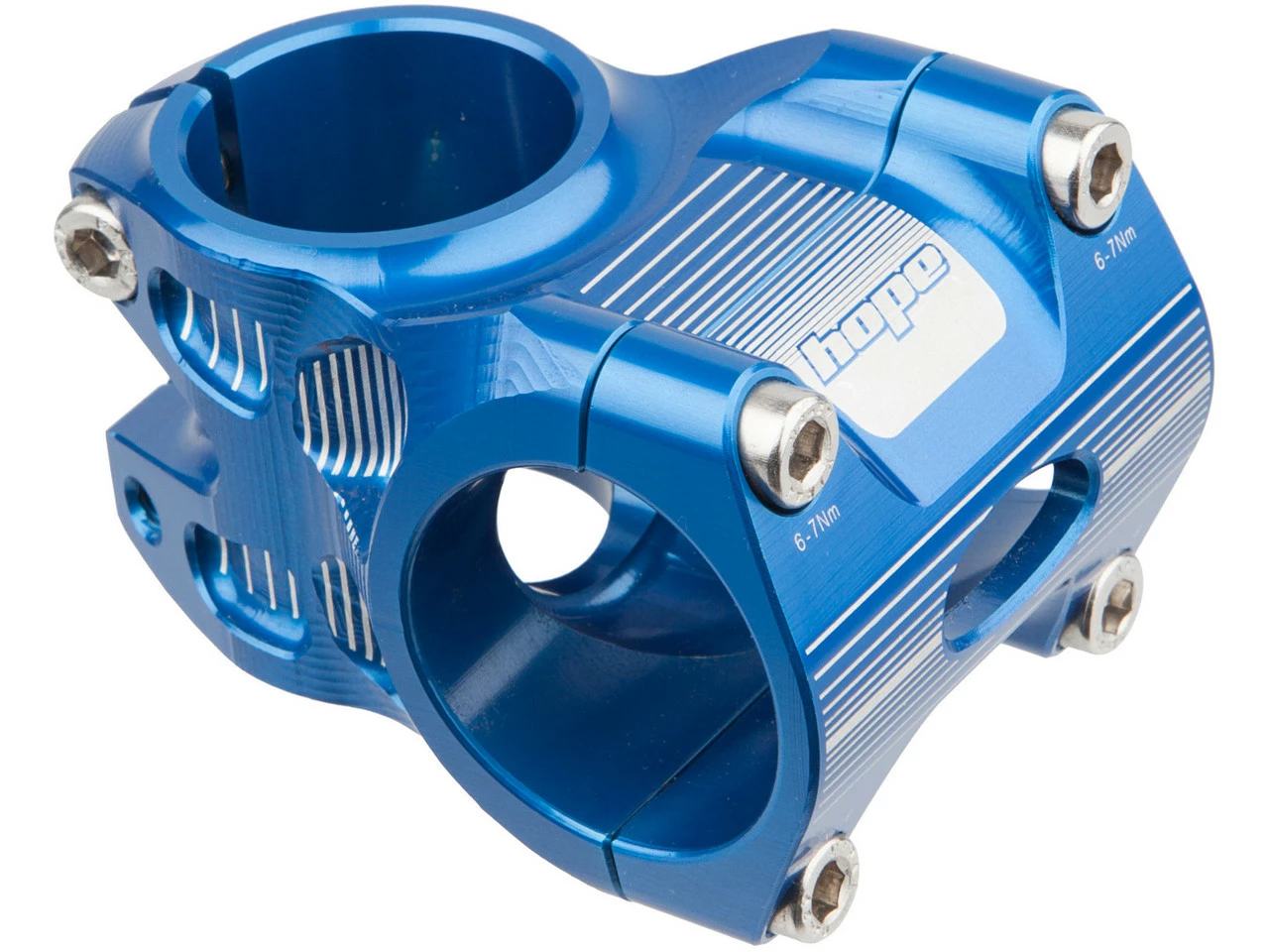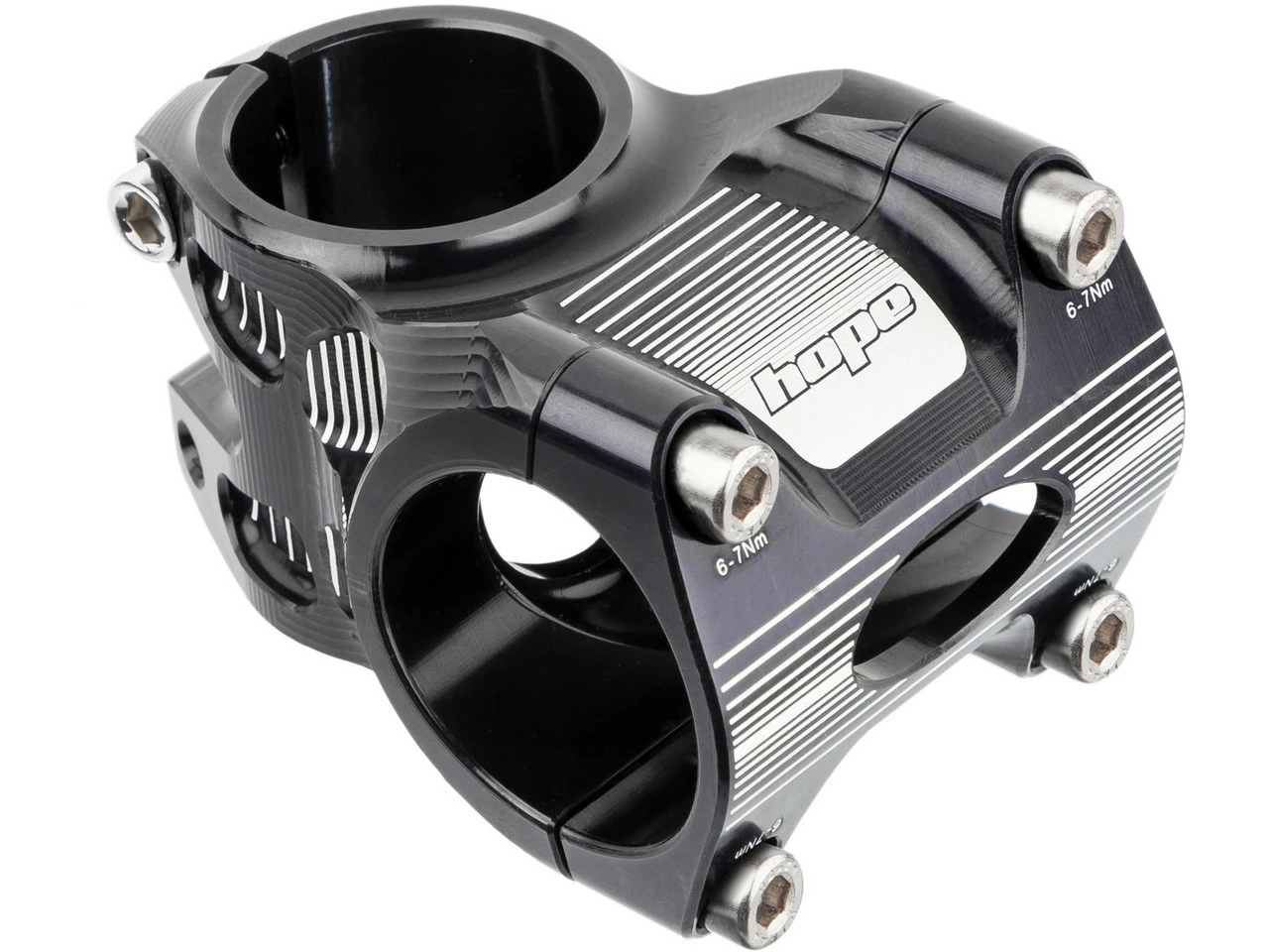 Beim Hope AM / Freeride Vorbau wurde Material eingespart, um ein gegenüber dem Vorgänger noch geringeres Gewicht zu erreichen. Auch das Frontkappen-Design ist überarbeitet worden. Die Gabelschaftklemmschrauben sorgen für viel Steifigkeit in der Lenkung.