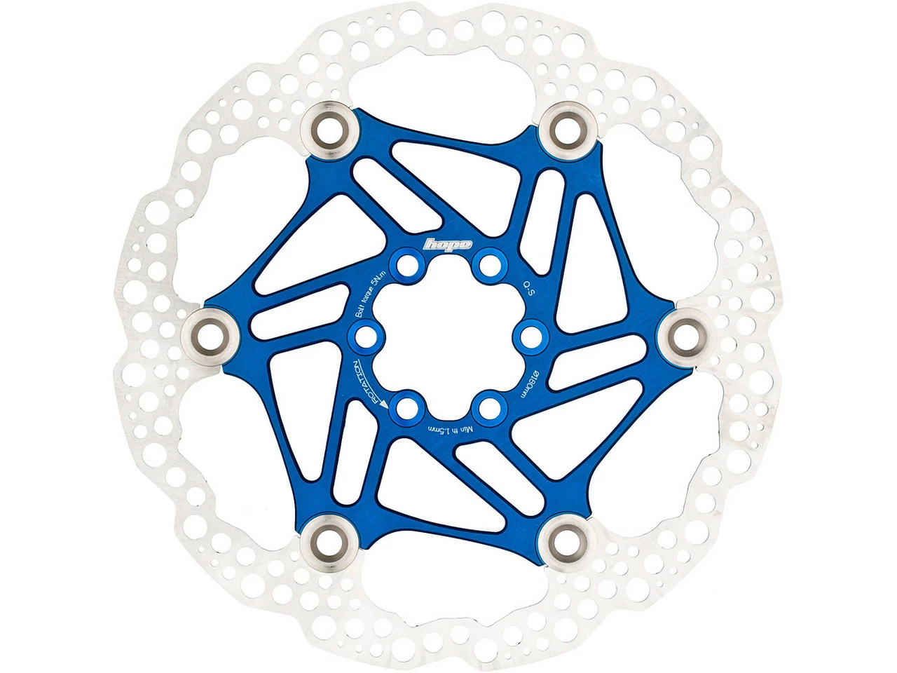 Die Hope Floating Disc ist eine schwimmend gelagerte Bremsscheibe, welche in zahlreichen Durchmessern und Farben erhältlich ist. Das Floating Design besteht aus zwei Teilen, einem Aluminium-Spider, der an der Nabe angebracht ist, und der eigentlichen Bremsscheibe aus Edelstahl, welche in Kontakt zu den Bremsbelägen steht. Wenn die Scheibe sich erhitzt, dann dehnt sie sich aus. Da sie aber nicht starr mit dem Spider verbunden ist, sondern “ schwimmend“ über Nietverbindungen, kann sie sich ganz frei ausdehnen und wieder zusammenziehen, ohne Druck auf den Spider auszuüben. Das beugt einem Verzug der Bremsscheibe vor. Ein weiterer Vorteil der Floating Rotoren ist ihr gegenüber Standard-Bremsscheiben geringeres Gewicht.