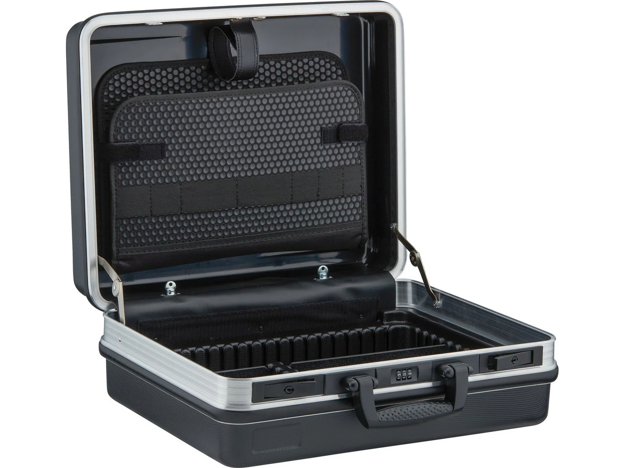 Spezifikationen:Material:Kunststoff, AluminiumMaße (LxBxH):41 x 46,5 x 20 cm (außen), 35 x 44 x 18 cm (innen)Volumen:27 LiterFeatures:41 SteckmöglichkeitenDokumentenfach im Deckelumlaufender Aluminiumrahmenstabiler, ergonomischer TragegriffMetall-Kippschlösser und dreistelliges ZahlencodeschlossMetallscharniereHerstellernummer:00 21 05 LE