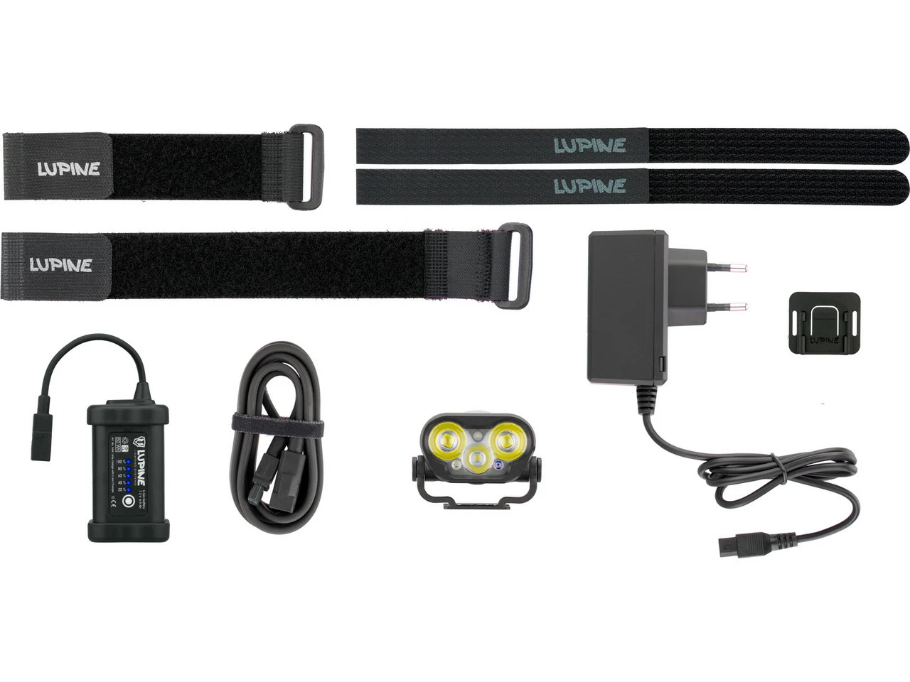 Lieferumfang:1 x Lampenkopf Lupine Blika1 x Li-Ion Akku Lupine SmartCore 6,9 Ah1 x Helmhalter Lupine FrontClick1 x Verlängerungskabel Lupine 120 cm1 x Ladegerät Lupine Wiesel2 x Klettband Lupine