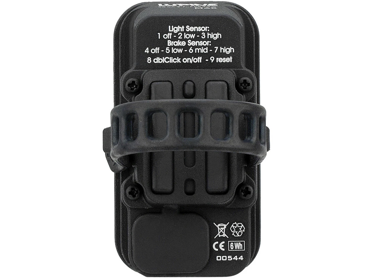 Spezifikationen :Ausführung:Rücklicht (rot)Leuchtmittel:LEDLeuchtkraft:160 Lumen, 80 Lumen, 40 Lumen, 20 Lumen, 8 LumenLeuchtdauer:bis zu 60 StundenBetriebsmittel:Lithium-Ionen Akku (integriert)Technische Daten:Leuchtmodi:4Batterieart:Lithium-Polymer-Akku, 1680 mAhSchutzklasse:IP 68 (Wasser- und Staubdichtigkeit), IK 09 (Schlagfestigkeit)Maße (H x B x T):60 x 32 x 30 mmMaterial:Aluminium 6061-T6, CNC-gefrästMontage:mit GummibandFeatures:integrierter Verzögerungssensor: erkennt zuverlässig jedes Bremsmanöver, lässt das Rotlicht in Sekundenbruchteilen heller werden und signalisiert so Deinem Hintermann, dass Du gerade langsamer wirstindividuell einstellbar: vier verschiedene Leuchtmodi und 5 Dimmstufenuniversell einsetzbare Halterung für einfache und sichere Befestigung an allen Sattelstützen zwischen 22 und 55 mm Durchmesserwasserdichtes und stoßfestes Gehäuse für den täglichen Einsatz bei Wind und Regenaufladbar per USBHerstellernummer:d792