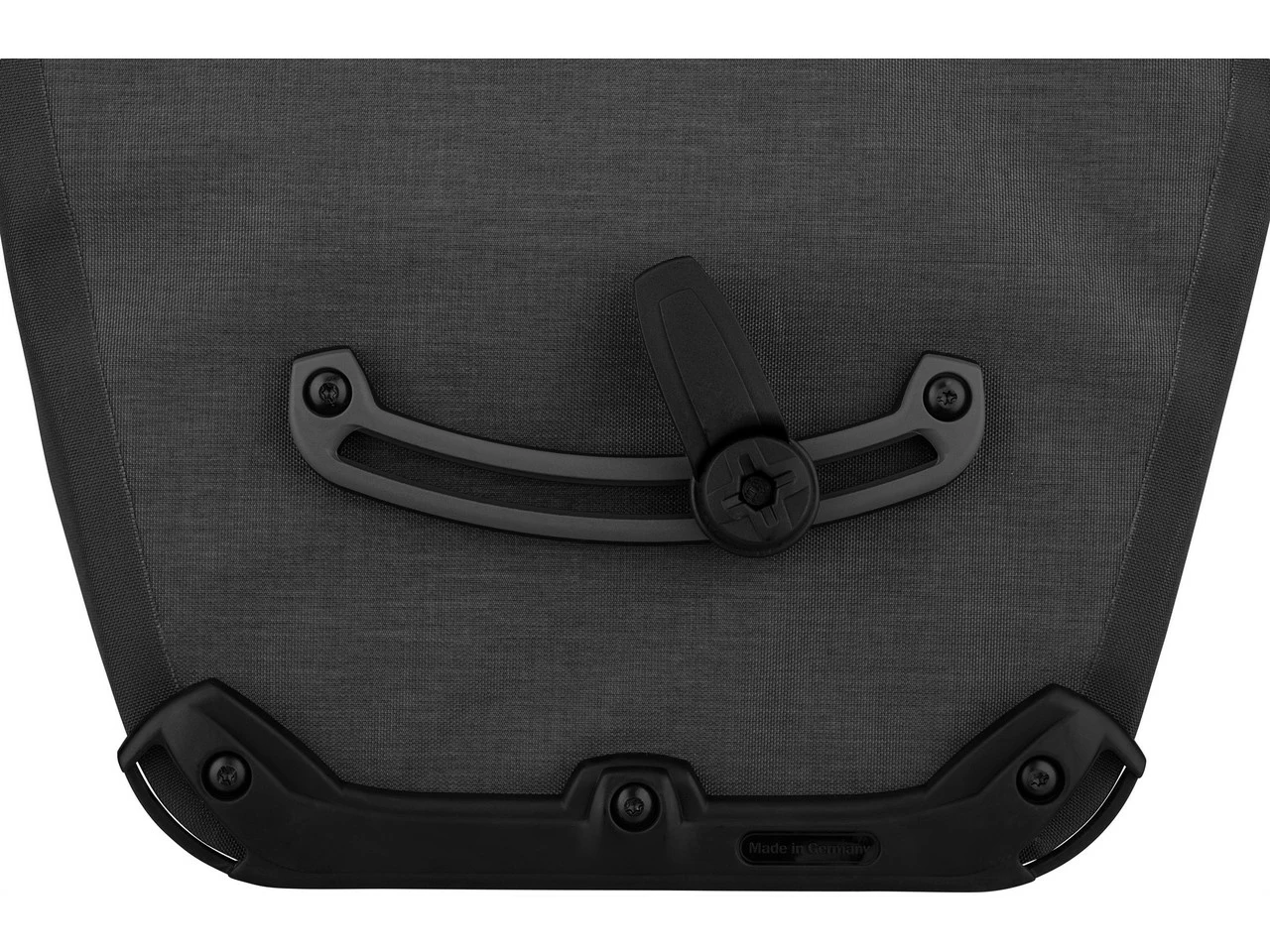 Das Quick-Lock2.1-Halterungssystem basiert auf dem bewährten Quick-Lock2-System, bietet jedoch einige Verbesserungen. Die obere Schiene, in der auch die optionale Diebstahlsicherung angebracht werden kann, ist einteilig ausgeführt, was ein Plus an Stabilität mit sich bringt. Auf der Innenseite kommen besonders flache Unterlegscheiben zum Einsatz, so wird der Tascheninhalt durch diese kaum beeinträchtigt. Der Taschengriff dient als Riegel: Hebst Du den Griff an, öffnen sich die Halterungshaken, lässt Du ihn los, schließen sie sich. Die Reduzierstücke für unterschiedliche Rohrdurchmesser werden seitlich eingeschoben und bleiben so sicher an Ort und Stelle. Zusätzlich zu den serienmäßig mitgelieferten 16 mm Grundhaken mit Reduzierstücken in 8 und 10 mm, liegen nun auch 12 mm Einsätze bei. Optional erhältlich ist zudem ein 20 mm Reduzierstück, passend für den Gepäckträger mit großem Rohrdurchmesser, wie sie teilweise an E-Bikes verbaut sind. Der Zwei-Komponenten-Kunststoff mit Anti-Scratch-Funktion, der für die untere Schiene in Form einer Halbellipse verwendet wird, sorgt für weiche Auflageflächen und reduziert die Reibung am Gepäckträger. Der untere Haken kann variabel angepasst und in 15-Grad-Schritten gedreht werden. Die Handhabung ist denkbar einfach: Für die Einstellung der Haken wird kein Werkzeug benötigt.