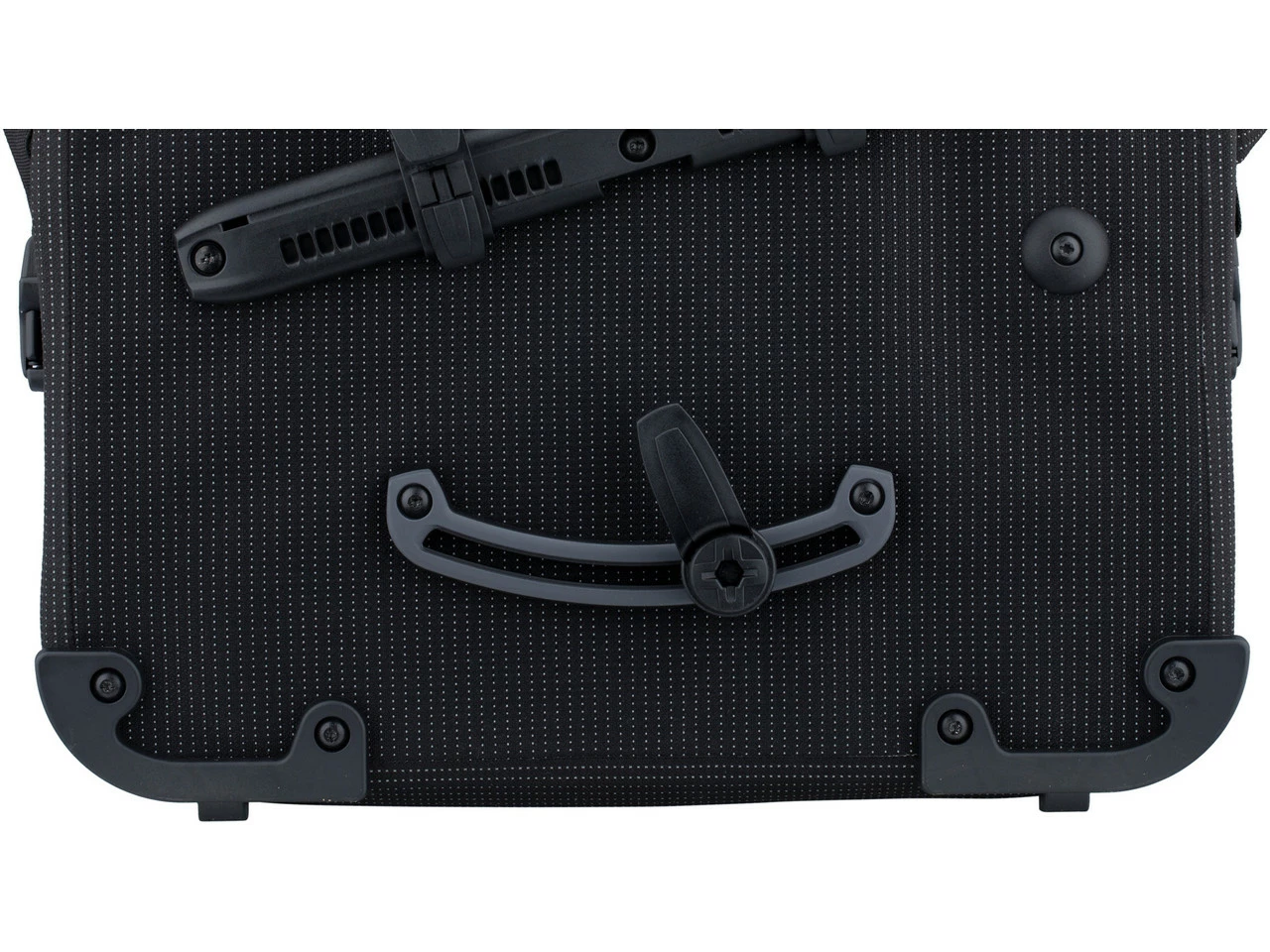 Das Quick-Lock2.1-Halterungssystem basiert auf dem bewährten Quick-Lock2-System, bietet jedoch einige Verbesserungen. Die obere Schiene, in der auch die optionale Diebstahlsicherung angebracht werden kann, ist einteilig ausgeführt, was ein Plus an Stabilität mit sich bringt. Auf der Innenseite kommen besonders flache Unterlegscheiben zum Einsatz, so wird der Tascheninhalt durch diese kaum beeinträchtigt. Der Taschengriff dient als Riegel: Hebst Du den Griff an, öffnen sich die Halterungshaken, lässt Du ihn los, schließen sie sich. Die Reduzierstücke für unterschiedliche Rohrdurchmesser werden seitlich eingeschoben und bleiben so sicher an Ort und Stelle. Zusätzlich zu den serienmäßig mitgelieferten 16 mm Grundhaken mit Reduzierstücken in 8 und 10 mm, liegen nun auch 12 mm Einsätze bei. Optional erhältlich ist zudem ein 20 mm Reduzierstück, passend für den Gepäckträger mit großem Rohrdurchmesser, wie sie teilweise an E-Bikes verbaut sind. Der Zwei-Komponenten-Kunststoff mit Anti-Scratch-Funktion, der für die untere Schiene in Form einer Halbellipse verwendet wird, sorgt für weiche Auflageflächen und reduziert die Reibung am Gepäckträger. Der untere Haken kann variabel angepasst und in 15-Grad-Schritten gedreht werden. Die Handhabung ist denkbar einfach: Für die Einstellung der Haken wird kein Werkzeug benötigt.