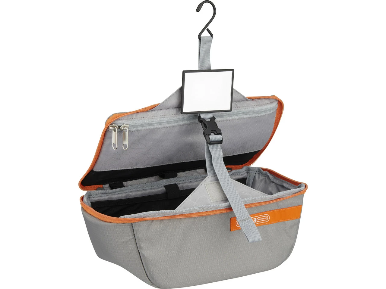 Der Toiletry Bag Kulturbeutel bietet Dir ein großes Hauptfach, Einsteckfächer und ein Reißverschlussfach im Deckel. Einmal aufgeklappt, benutzt Du den Aufhängehaken, der während des Transports an einer Lasche gesichert ist, um den Beutel aufzuhängen. Ein verstellbarer Haltegurt mit Steckschnalle verhindert dabei, dass der Inhalt herauspurzelt. Für den Spiegel stehen Dir zwei Klettpositionen zur Verfügung.