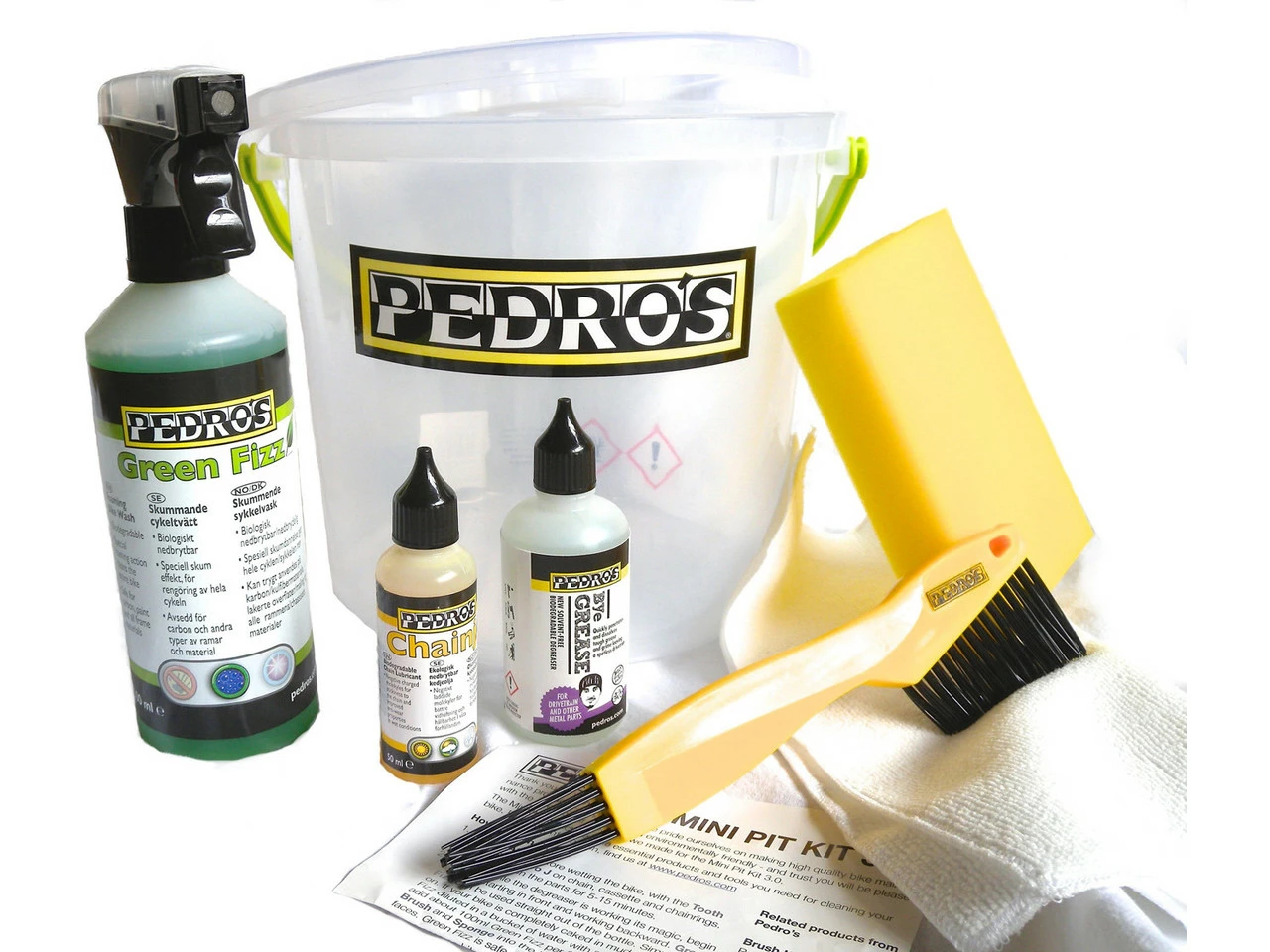 1 x Reiniger Pedros Green Fizz 500 ml1 x Entfetter Pedros Bye Grease 100 ml1 x Kettenschmiermittel Pedros Chainj 100 ml1 x Schwamm1 x Reinigungsbürste Toothbrush1 x Mikrofasertuch1 x Kunststoff-Eimer 7 Liter