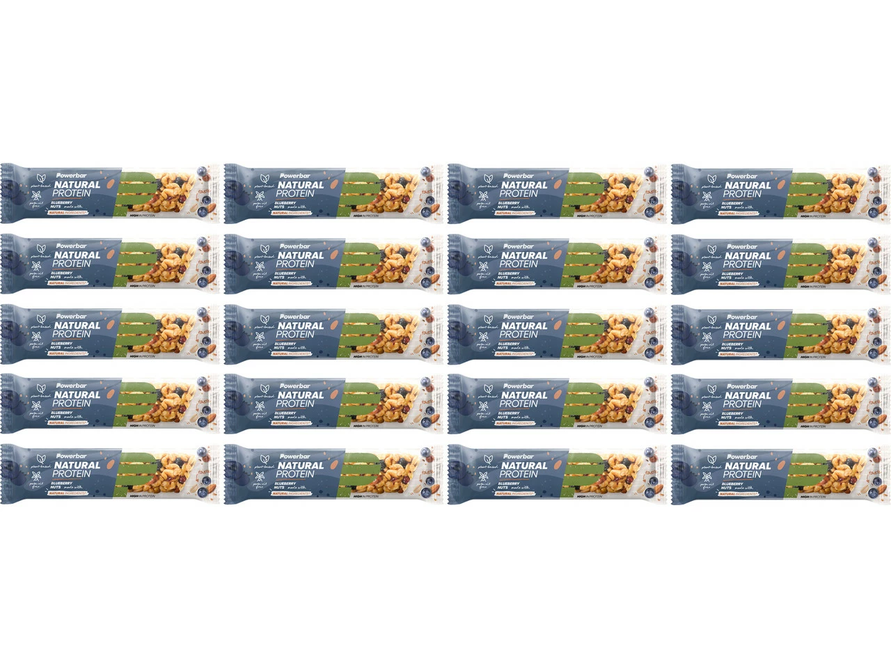 Sojacrisps (23,5 %) (isoliertes Sojaeiweiß*, Stärke*, Salz), Glukose-Fruktose-Sirup*, geröstete Erdnüsse* (10,9 %), Maltodextrin*, Sojabohnen* (7,2 %), Erbsenprotein* (6,3 %), Palmfett*, kandierte Cranberries* (5,4 %) (Zucker*, Cranberries*, Reismehl*, Sonnenblumenöl*), Fruktose, geröstete Mandeln* (4 %), kandierte Heidelbeeren* (3,4 %) (Heidelbeeren*, Zucker*, Reismehl*, Sonnenblumenöl*) Feuchthaltemittel (Glycerin*), natürliche Aromen*, Säuerungsmittel (Citronensäure*), Salz, Vanilleextrakt*, Emulgator (Sojalecithine*). * natürliche Zutat.