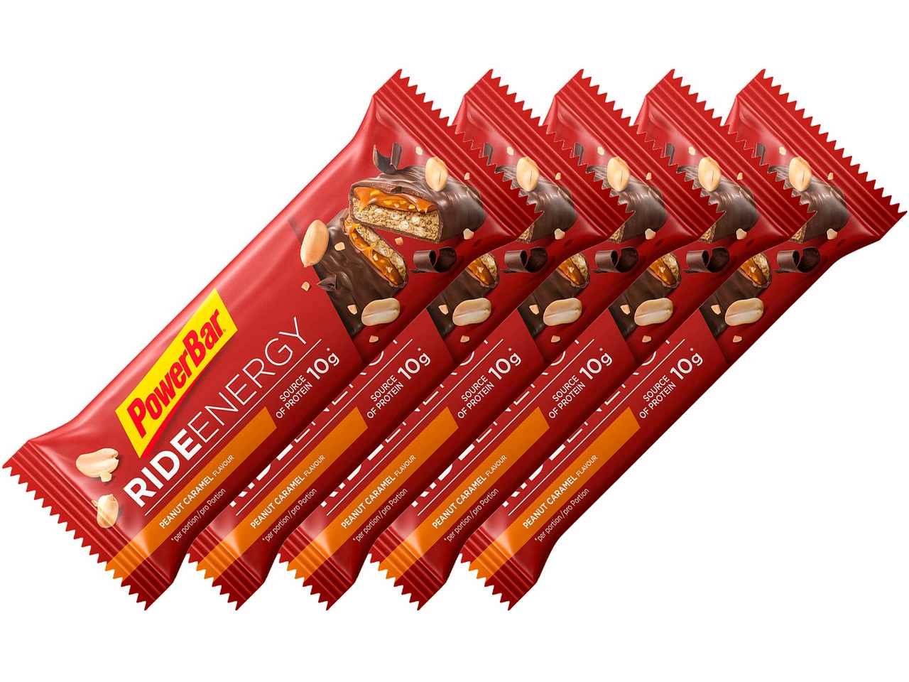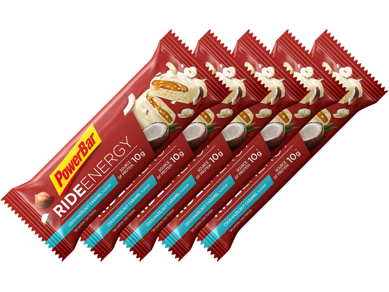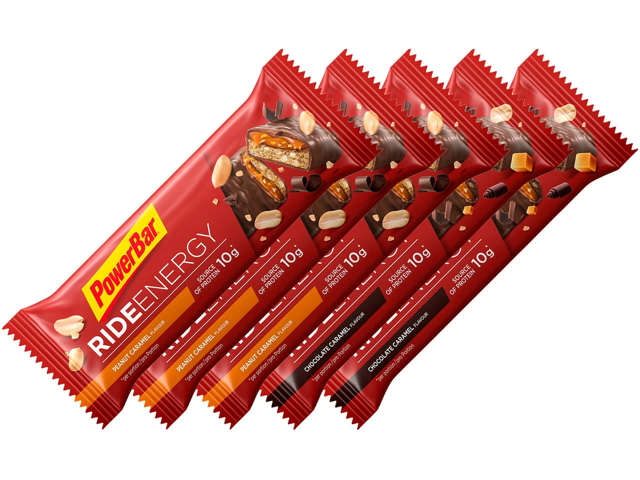 2 x Riegel PowerBar Ride Energy, Nettofüllmenge 110 g, peanut-caramel2 x Riegel PowerBar Ride Energy, Nettofüllmenge 110 g, chocolate-caramel1 x Riegel PowerBar Ride Energy, Nettofüllmenge 55 g, coco-hazelnut caramel