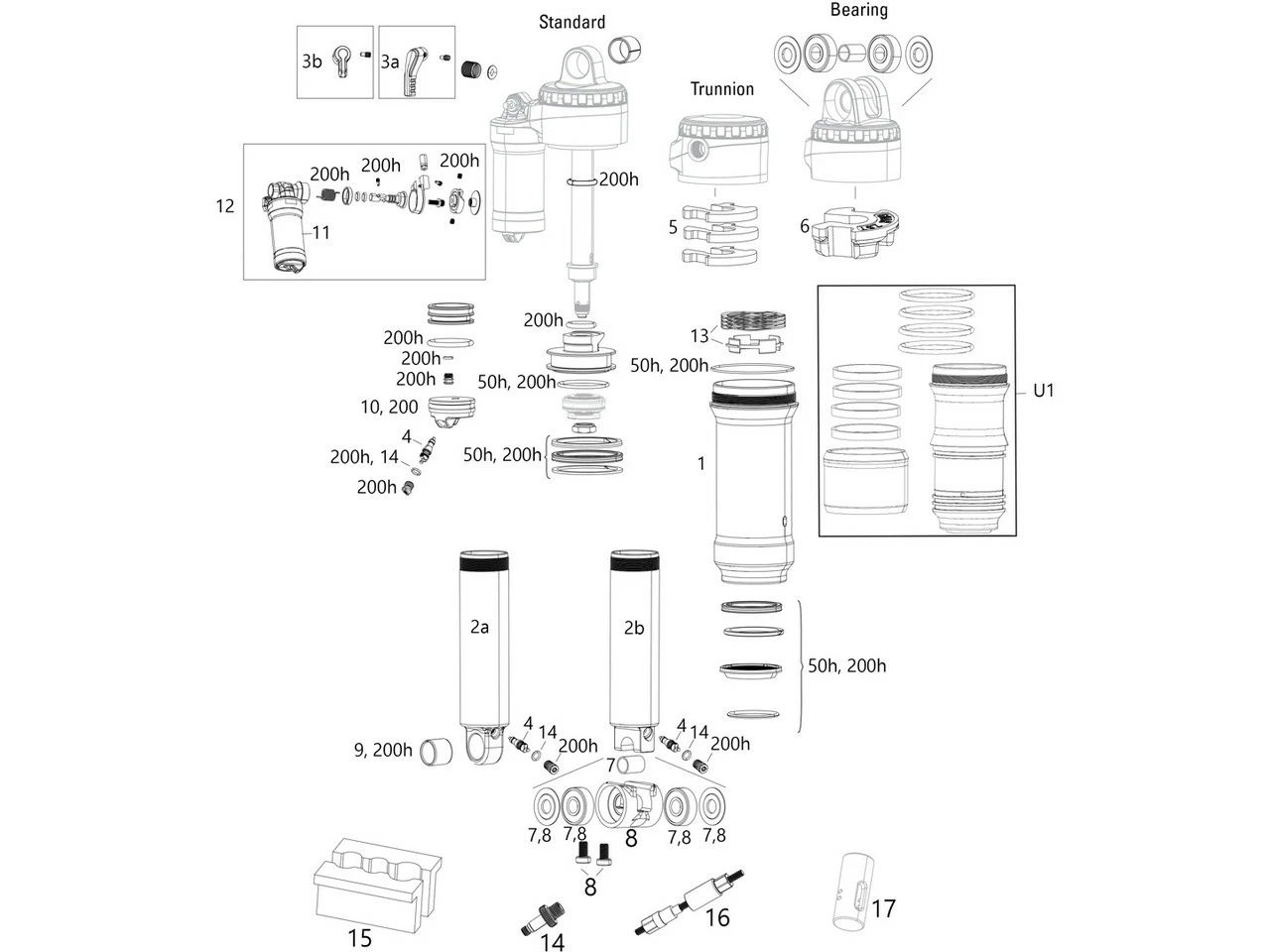 Service Kit 200 Stunden/1 Jahr für Super Deluxe (A1-B2, 2017-2020) Dämpfer, mit Luftkammerdichtungen, Kolbendichtung, Führungsringen, IFP-Dichtungen, Ausgleichsbehälter-Dichtungen, Dichtungsfett/-öl