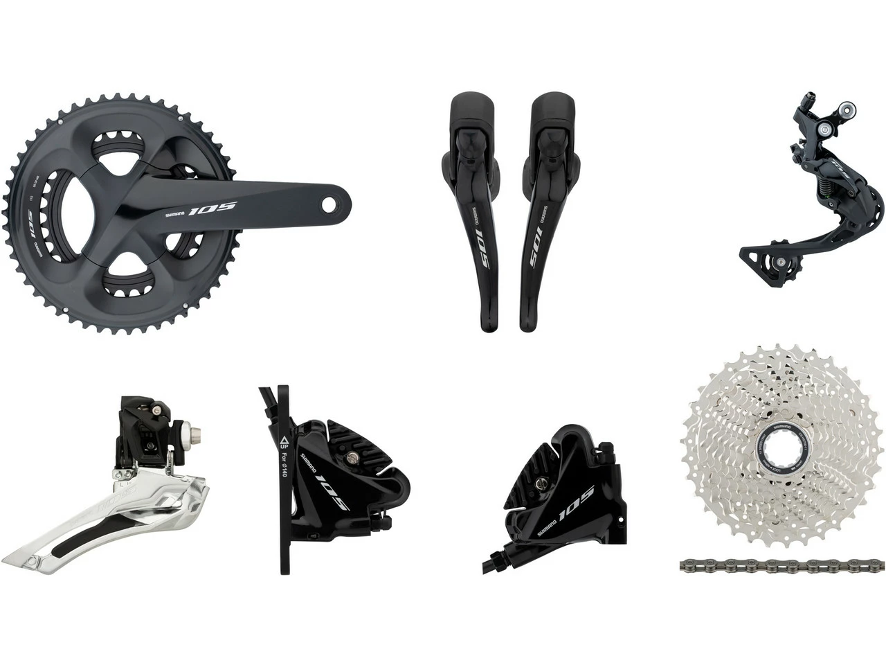 1 x Kurbelgarnitur Shimano 105 (FC-R7000)1 x Schaltwerk Shimano 105 (RD-R7000)1 x Umwerfer Shimano 105 (FD-R7000)1 x Kassette Shimano 105 (CS-R7000) oder CS-HG700-11 (11-34)1 x Kette Shimano 105 / SLX Quick-Link (CN-HG601-11)2 x Scheibenbremse Shimano 105 BR-R7070 + ST-R7020, VR und HR1 x Bremsleitung Shimano SM-BH90-JK-SS 1000 mm (VR)1 x Bremsleitung Shimano SM-BH90-JK-SS 1700 mm (HR)2 Paar Bremsbeläge Shimano1 x Scheibenbremsadapter für VR 140/160 + 160/180 mm2 x Leitungsanschlussset mit Oliven und Insertpins2 x Befestigungsschraube Typ A (für VR)2 x Befestigungsschraube für 25 mm Rahmendurchmesser (HR)1 x Kurbelschraube Shimano1 x Außenhülle Shimano OT-RS900 240 mm1 x Endkappe verlängert für Schaltwerk1 x Kassetten-Abschlussring Shimano Stahl1 x Kassetten-Spacer Shimano 1,85 mm (nur bei 11-34)1 x Kettenschloss Shimano SM-CN900-11 Quick-Link1 x Schaltzug 1800 mm1 x Schaltzug 2200 mm3 x Schaltzug-AußenhülleBremsenset montagefertig, befüllt, nach der Montage ist eine Entlüftung zu empfehlen