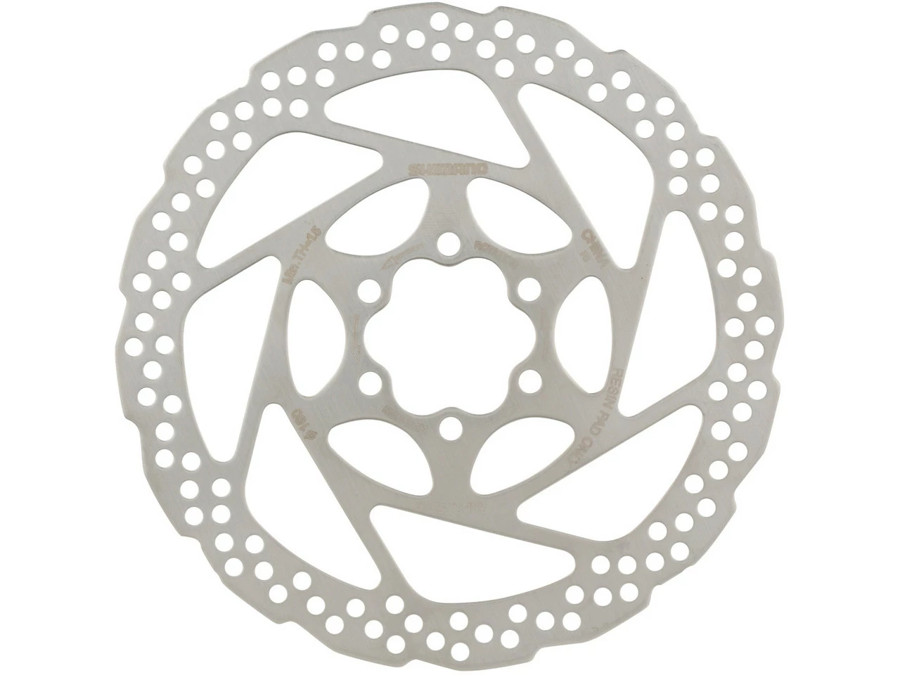 Die Shimano SM-RT56 6-Loch-Bremsscheibe besteht aus einteilig geformtem Edelstahl, der zusätzlich wärmebehandelt und poliert wurde. Sie ist in 160 mm und 180 mm Durchmesser erhältlich und kann für XTR, XT, SLX, Deore und viele weitere Bremsen aus dem MTB-, Trekking- und City-Bereich eingesetzt werden. Beachte dass SM-RT56 nur mit organischen Bremsbelägen kompatibel ist.