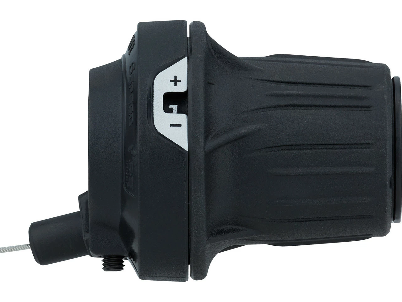 Shimano Revoshift-Schaltgriffe werden zum Schalten einfach zwischen Daumen und Zeigefinger gedreht, sodass der Lenker fest im Griff bleiben kann. Diese einfache, sichere Art des Schaltens kommt besonders Gelegenheitsfahrern und Kindern entgegen. Die gestufte Form des Drehschalters sorgt dafür, dass er sich unabhängig von der Handgröße problemlos betätigen lässt.