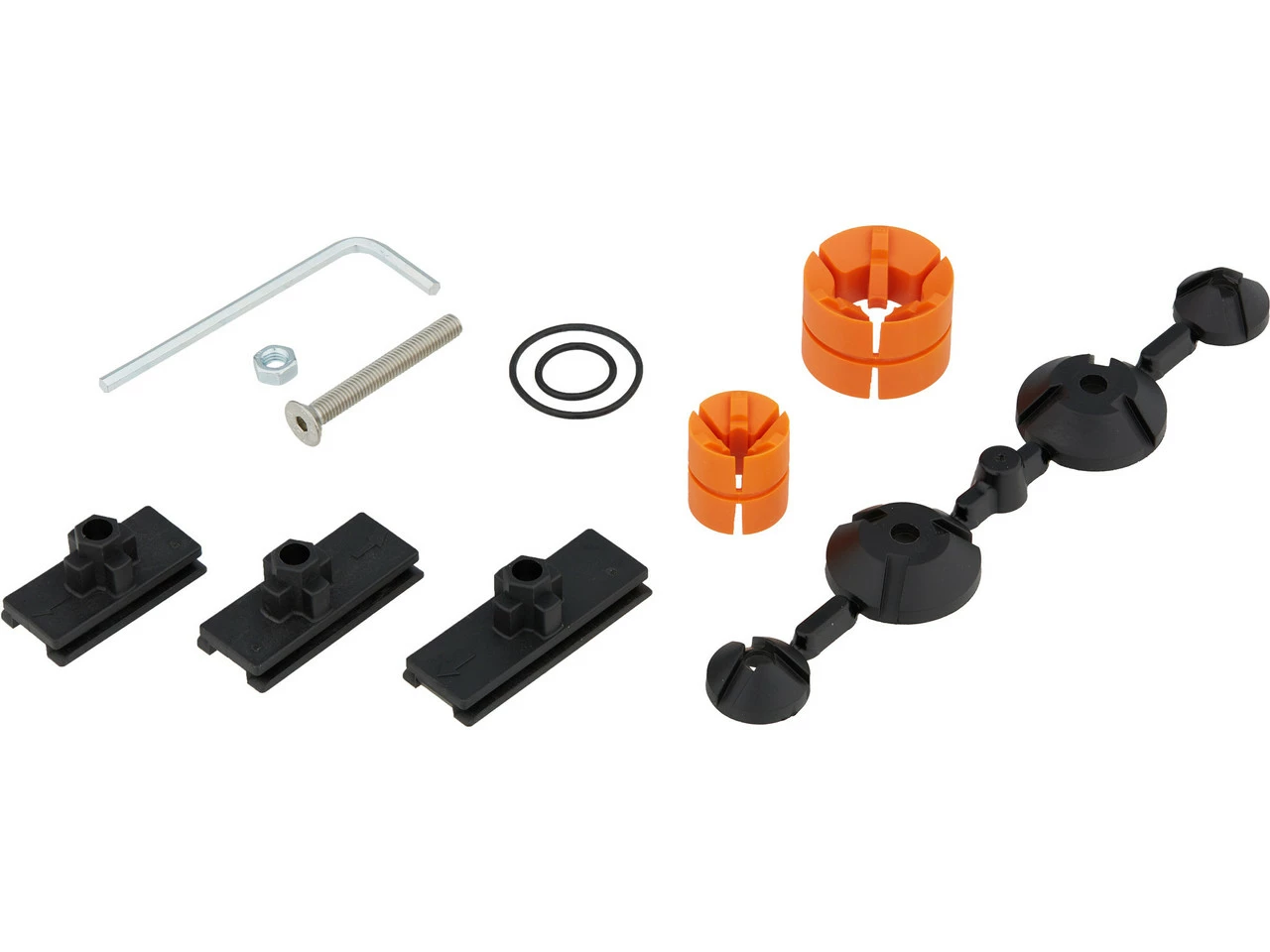 1 x Spreizhülse groß 29 – 39 mm1 x Spreizhülse klein 19 – 29 mm2 x Spreizkonus groß2 x Spreizkonus klein1 x Gummiring groß1 x Gummiring klein1 x Adapterschiene kurz 35 mm1 x Adapterschiene mittel 41 mm1 x Adapterschiene lang 47 mm1 x Innensechskant-Schlüssel1 x Schraube1 x Mutter