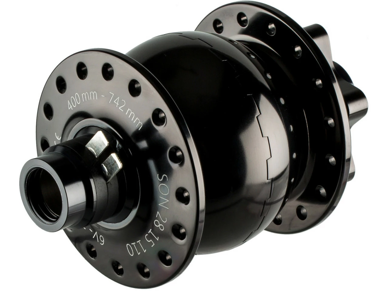 Dieser SON 28 Steckachs-Nabendynamo im Boost-Standard für 110 mm Klemmbreite hat zwei gleich große, symmetrische Flansche. Das macht den Laufradbau einfacher und das Laufrad steifer und stabiler.