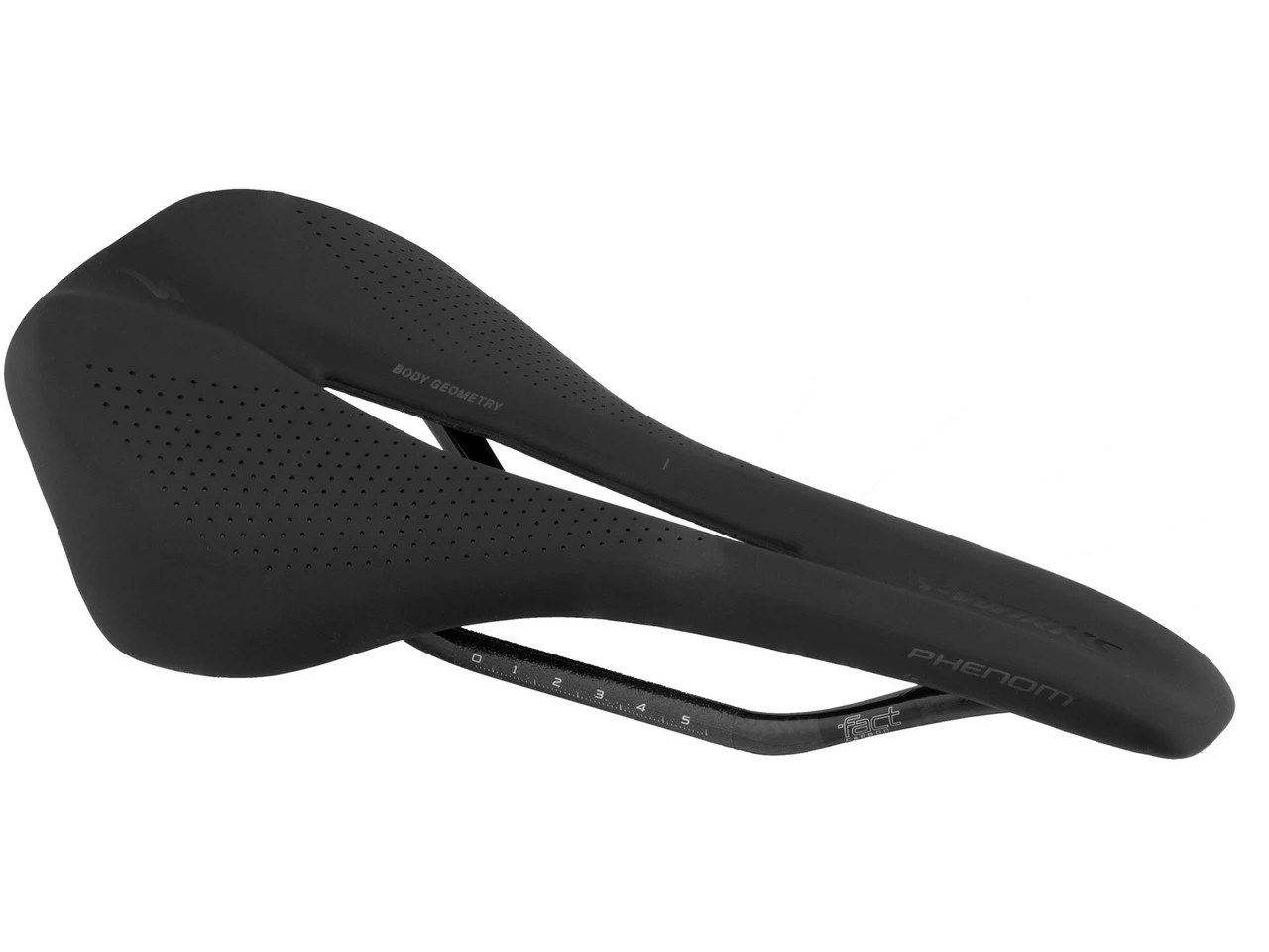 Der S-Works Phenom Sattel von Specialized für Road- und Offroad-Rennen besticht mit besonders geringem Gewicht und hoher Steifigkeit. Er wurde mit einer Sattelschale aus sorgfältig ausgewählten und fachkundig verarbeiteten Carbonfasern (FACT™-Technologie) sowie mit Oversize-Streben aus Carbon ausgestattet. Dank Body Geometry Design inklusive schmaler Aussparung in der Mitte ist die arterielle Durchblutung im empfindlichen Sitzbereich zu jedem Zeitpunkt gewährleistet. Der Sattel wurde mittelstark gepolstert, um auch bei längeren Fahrten eine optimale Balance zwischen Dämpfung und Feedback herzustellen. In der Schale befinden sich Gewinde, die das Anbringen von Specialized SWAT™-Zubehör erlauben.