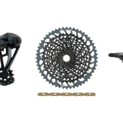 Dieses SRAM Upgrade-Kit der Serie GX Eagle ist für 1×12-fach-Antriebe an E-Bikes im Gelände konzipiert und kommt direkt mit Kassette. Es setzt sich zusammen aus einem GX Eagle Schaltwerk, einem spezifischem GX Eagle Trigger Single Click Schaltgriff für E-MTBs, einer XG-1275 Kassette sowie einer PC XX1 Eagle oder PC GX Eagle Kette.