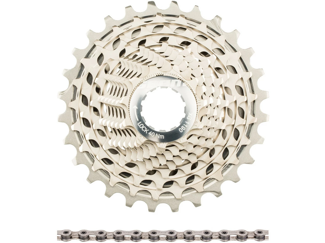 Technische Daten Kassette:Einsatzbereich:RennradMaterial Ritzel:StahlMaterial Verschlussring:AluminiumSchaltstufen:11Abstufungen:11-25 Z / 11-26 Z / 11-28 Z / 11-30 Z oder 11-32 Zempfohlene Kette:Red 22, PC-1170empfohlene Gruppe:RedTechnische Daten Kette:Serie:Red 22Material:StahlGröße:11/128″Schaltstufen:11-fachGlieder:114Außenlasche:Nickel-SilberInnenlasche:Nickel-SilberVerschlussglied:PowerLock™Nietentyp:Hohlstifte (Hollow Pins), verchromtempfohlene Gruppe:SRAM Force, SRAM RedTechnologien:PowerChain™, PowerLock™, PowerLube™Technologien:PowerChain™: