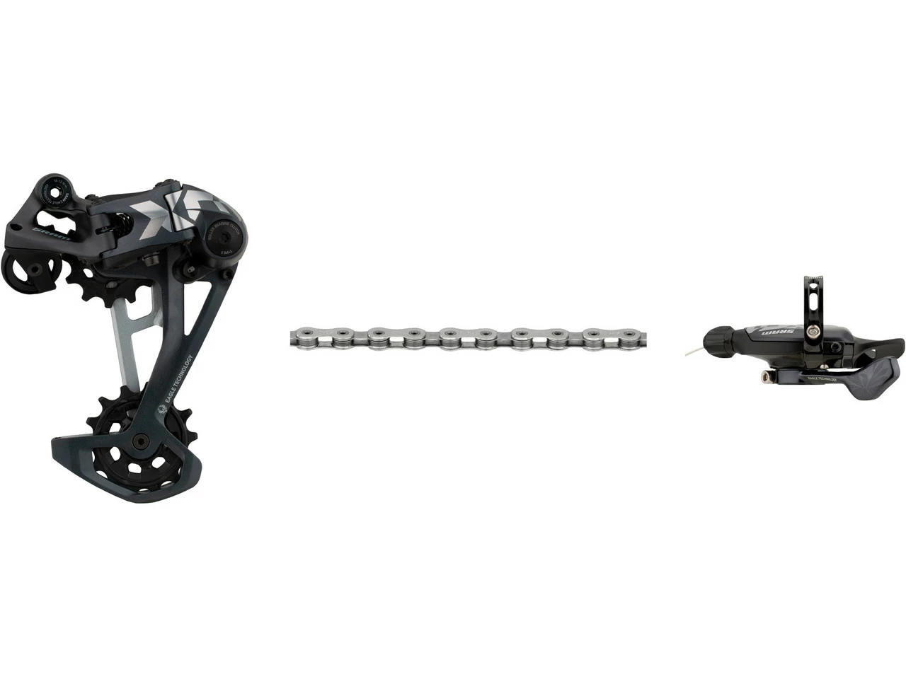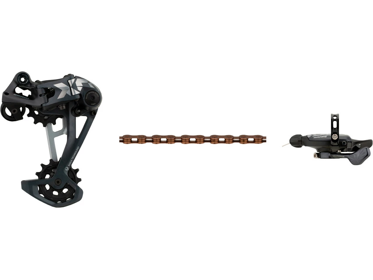 Schaltwerk:lunar (dunkelgrau)Schaltgriff:lunar (dunkelgrau)Kette:nach Wahl XX1 rainbow (bunt), XX1 copper (kupferrot), XX1 gold, XX1 black, X01 silverHerstellernummern:Schaltwerk: 00.7518.138.001Schaltgriff: 00.7018.433.001Kette: 00.2518.039.010 (XX1 rainbow), 00.2518.043.010 (XX1 copper), 00.2518.024.020 (XX1 gold), 00.2518.024.021 (XX1 black), 00.2518.023.011 (X01 silver)Lieferumfang:1 x Schaltwerk SRAM X01 Eagle1 x Schaltgriff SRAM Trigger X01 Eagle 12-fach1 x Kette SRAM PC XX1 Eagle oder PC X01 Eagle (nur X01 silver)1 x Kettenschloss SRAM PowerLock1 x Klemmschelle SRAM1 x Schaltzug SRAM 2200 mm1 x Einstelllehre SRAM Chain Gap Adjustment GaugeDirekt mitbestellen:Schaltzugaußenhülle