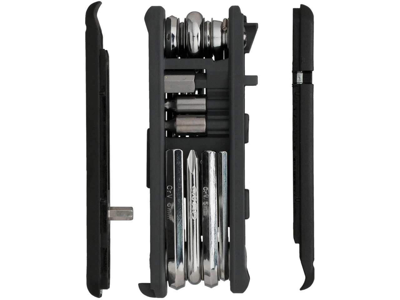 Technische Daten:Material Körper:Fiberglas-CompositeMaterial Werkzeug:Chrom-VanadiumGröße (L x B x H):90 x 40 x 27 mmFunktionen:21Funktionen:KreuzschlitzschraubendreherInnensechskant: 2, 2,5, 3, 4 (2x), 5 und 6 mmTorx: T15, T25 und T30Bit-Erweiterung: 5 mm auf 8 mm InnensechskantSpeichenschlüssel: 14G, 15GKettennieter (bis 12-fach), nicht kompatibel mit 11-fach Campagnolo Hollow Pin KettenKettenfixierhaken2 ReifenheberPresta-VentilwerkzeugFeatures:Reifenheber in die Seiten des Werkzeugkörpers integriertHerstellernummer:TT2573B