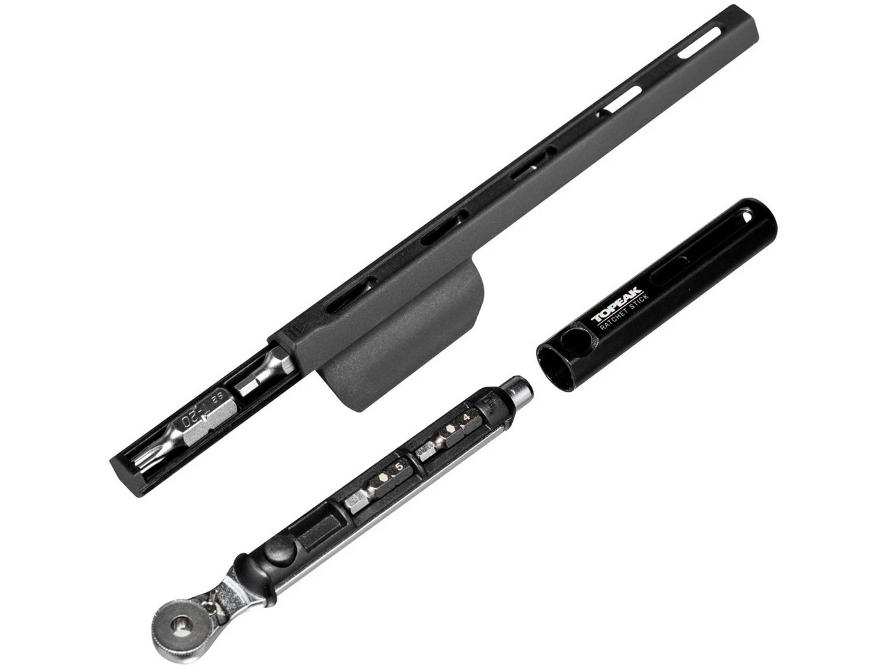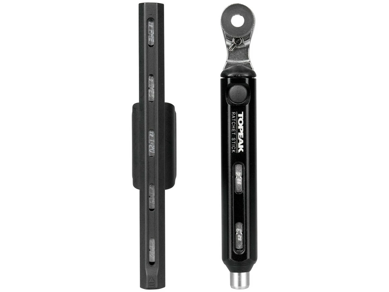 Der Topeak Ratchet Stick ist eine kompakte, umschaltbare Ratsche für unterwegs. Die 10 mitgelieferten Werkzeug-Bits lassen sich komfortabel im Griff der Ratsche und dem abnehmbaren Bithalter verstauen, Sichtfenster ermöglichen schnelles Finden des richtigen Bits.
