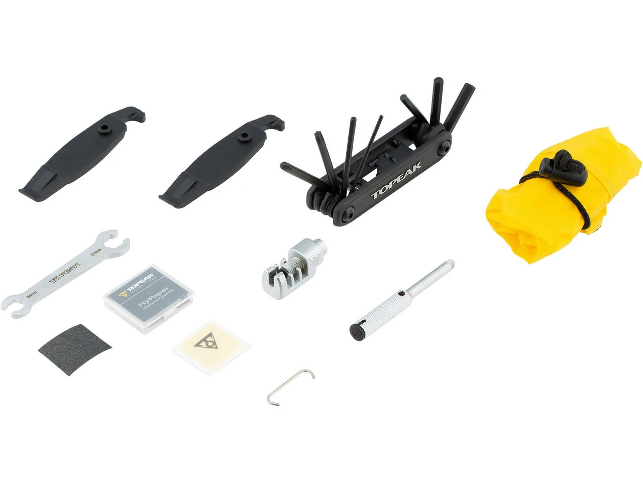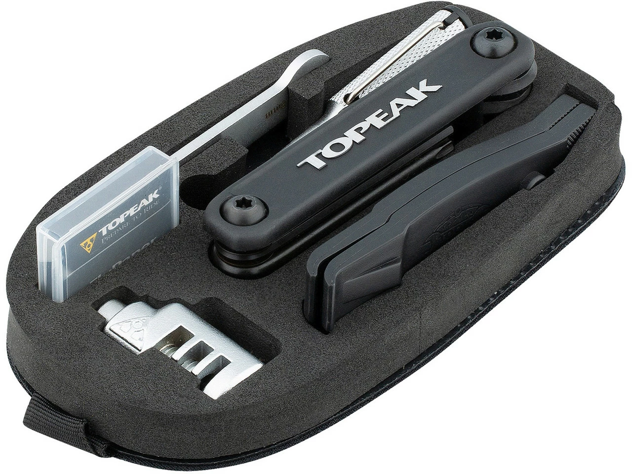Lieferumfang:1 x Satteltasche Topeak Survival Tool Wedge Pack II1 x Regenhülle Topeak1 x Halterung Topeak QuickClick Fixer 251 x Werkzeugset Topeak