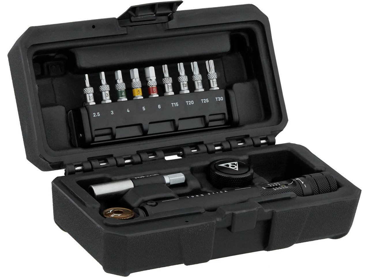 Lieferumfang:1 x Drehmomentschlüssel Topeak Torq Stick Pro 2-10 Nm5 x Innensechskant-Aufsatz4 x Torx-Aufsatz1 x Topeak Fingertip Bithalter1 x Bithalter mit Speed Sleeve, magnetisch1 x Aufbewahrungsbox