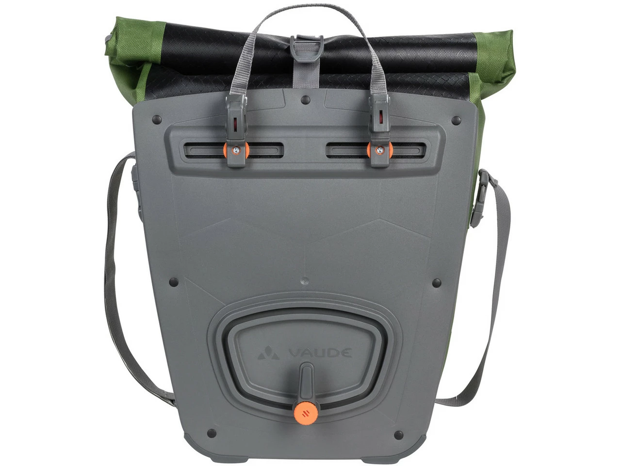 Die wasserdichte Hinterradtasche mit dezentem Printaufdruck wird aus robustem, PVC-freiem Planen-Material klimaneutral am deutschen VAUDE-Standort in der Nähe des Bodensees hergestellt. Sie lässt sich durch den Wickelverschluss auf individuelle Größen bringen und absolut dicht verschließen. Für Übersichtlichkeit sorgt eine einfache Innentasche. Die Radtasche wird mit dem QMR 2.0-System und stabiler Rückenplatte rechts oder links am hinteren Gepäckträger befestigt, ist einfach über ein Handrädchen justierbar und lässt sich schnell und einfach abnehmen. Mit einem Fahrradschloss kann sie direkt am QMR-Haken verriegelt werden. Reflexelemente sorgen für eine gute Sichtbarkeit im Straßenverkehr.
