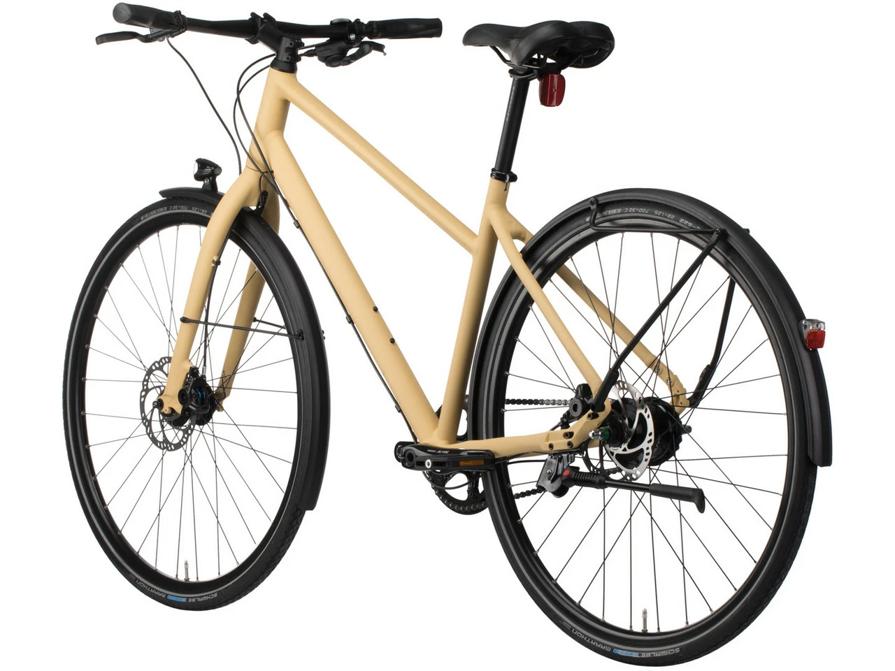 Spezifikationen:Einsatzbereich:City, Touring & TrekkingLaufradgröße:28″Größen:XS, SMaterial Rahmen:Aluminium (6061)Material Gabel:Aluminium (6061)Komponenten:Rahmen:Vortrieb Modell 1 DamenGabel:Vortrieb Modell 1 Straight StarrgabelVorbau:Vortrieb Modell 1 31,8 x 6°Lenker:Vortrieb Modell 1 Flat 660 mm x 16°Lenkergriffe:Vortrieb CampusSteuersatz:Acros AiX-330 Fiber, IS41/28,6-IS41/30Sattelstütze:Vortrieb Modell 1 27,2 x 400 mmSattel:Vortrieb CampusKurbel:Shimano Alfine FC-S501 (42 Z)Pedale:Vortrieb Urban Grip mit Grip TapeBremsen/Bremshebel:Magura MT4N Carbotecture Scheibenbremsen, 2-Kolben, 4-Finger, mit Storm HC Rotoren 160 mmSchalthebel:Shimano Alfine SL-503 8-GangAntrieb:Vortrieb Campus (20 Z)Schutzbleche:Hebie Wingee Aluminium mit TaschenstrebenScheinwerfer:busch+müller Lumotec IQ2 Eyc NRücklicht:Herrmans H-Trace miniParkstütze:Hebie 661 für KSA40 HinterbaubefestigungFelgen:Vortrieb Urban TourSpeichen:VortriebVorderradnabe:Shimano H-T4050-1D NabendynamoHinterradnabe:Shimano Alfine SG-S7001 8-GangReifen:Schwalbe Marathon Performance GreenGuardFreigaben:Gewichtsbeschränkung:130 kg GesamtgewichtBremsscheibengröße max.:160 mm hinten, 180 mm vorneReifengröße max.:32-622Features:hochwertigste Rahmenverarbeitung: verschliffene Schweißnähte für cleanes, zeitloses Design; umweltfreundliche, robuste Pulverbeschichtung für edles Finishzuverlässig: Alfine 8 Gang Nabenschaltung ist bewährt und leiseAusstattung vom Feinsten: Beleuchtung von busch+müller, Scheibenbremsen von Maguraselbst versteckte Details wie die Acros Lager entstammen dem High-End Regalsportive Fahreigenschaften: antrittssteif und wendigDesignanspruch mit Nutzwert vereint: Wingee Schutzblech-/Trägersystem kann 8 kg je Seite aufnehmen und ermöglicht damit auch Einkäufe oder TagesausflügeGeometrie:XS: